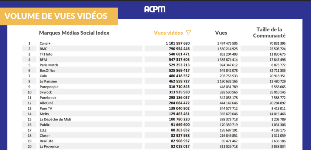 Quelle arrivée pour Canal+ dans le classement Social Index de l’ACPM qui mesure les vues vidéos des médias partenaires. Sur le mois de novembre, les marques médias cumulent 8,8 milliards de vues vidéo, toutes plateformes confondues. Le tout nouvel arrivé dans le classement, Canal+, prend déjà sa tête avec plus de 1,1 milliard de vues vidéo sur un mois.