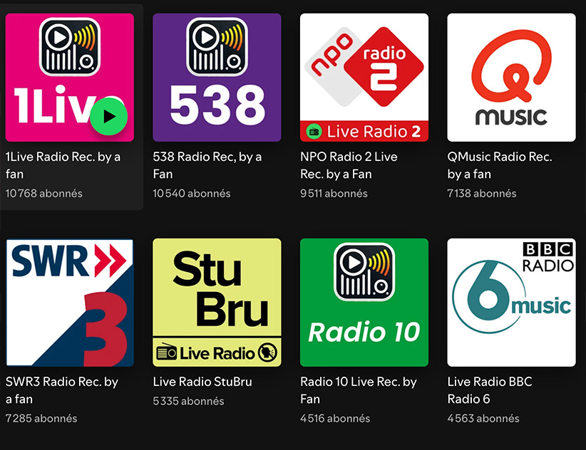 Sur Spotify, vous avez le profil LiveRadio qui propose chaque jour la playlist de la veille d’une cinquantaine de radios dans le monde.
