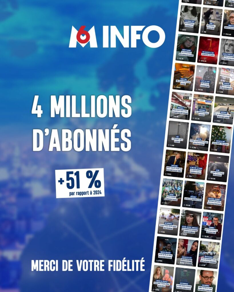 La dynamique se voit aussi côté communauté. M6Info dépasse désormais les 4 millions d’abonnés cumulés sur les plateformes sociales, +51% depuis 2024. Un seuil symbolique pour un acteur info français, dans un contexte de concurrence extrême avec les autres marques médias d’informations et les créateurs indépendants.