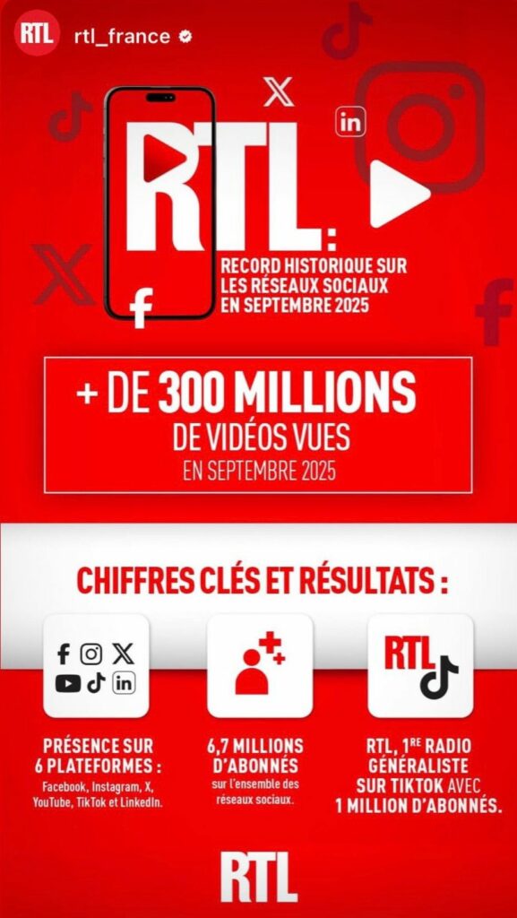 Dans un communiqué, RTL annonce avoir dépassé la barre des 300 millions de vues tous réseaux sociaux confondus. Soit une augmentation de 55% par rapport à septembre 2024.
