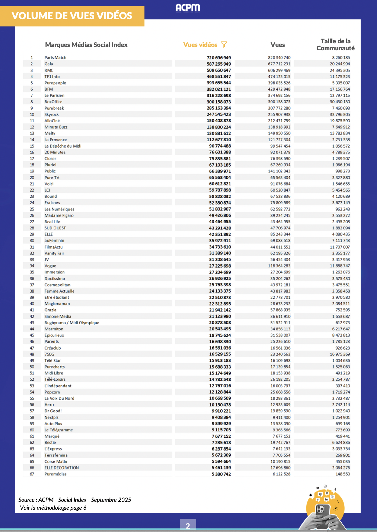 Le dernier Social Index publié par l’ACPM confirme la puissance des grands médias français sur les plateformes sociales. En septembre, Paris Match, Gala et RMC se distinguent par leurs performances vidéo exceptionnelles, cumulant à eux trois plus de 1,8 milliard de vues.