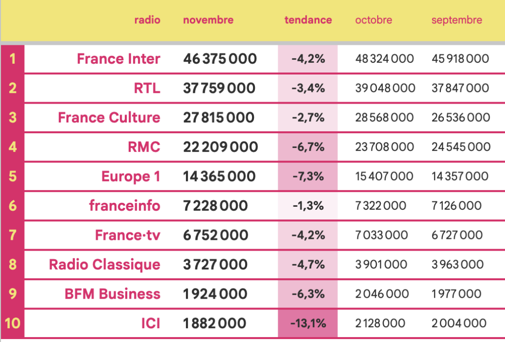 France Inter confirme sa place de leader, atteignant 46,375 millions d’écoutes en novembre, malgré un recul par rapport à son pic d’octobre.