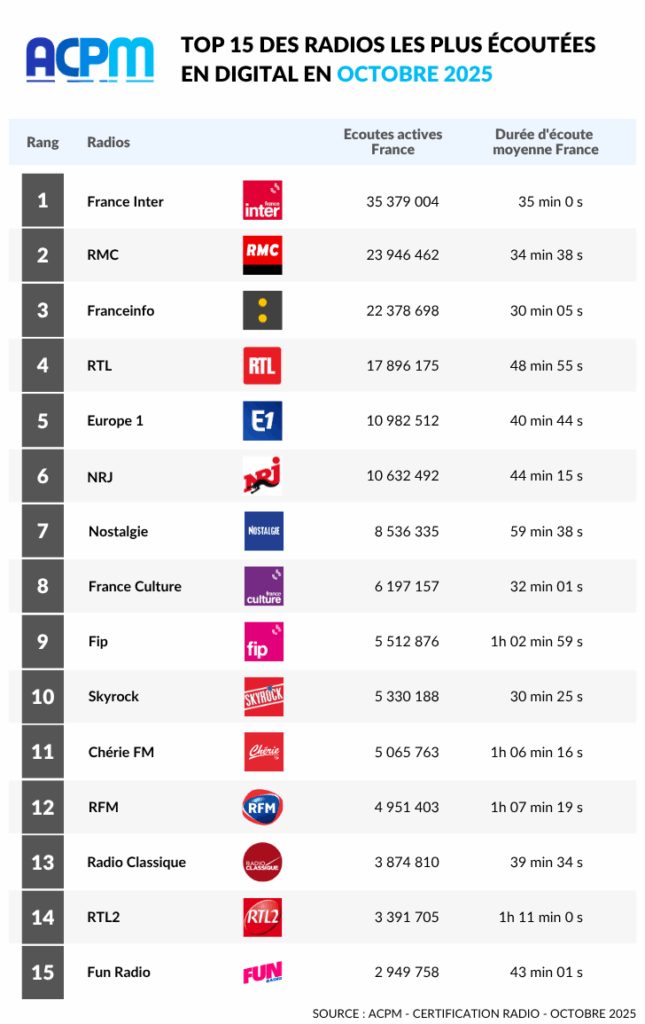 Tout d’abord, le classement de l’ACPM des radios les plus écoutées en digital en France en octobre 2025.