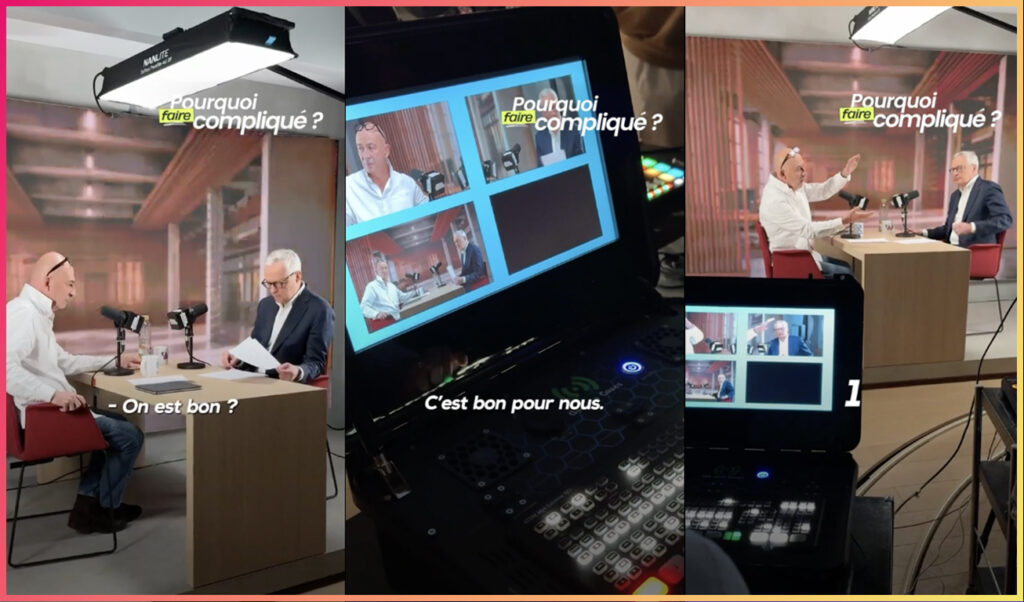 Dans la vidéo de présentation, on y découvre le studio de podcast : l’un en face de l’autre avec deux micros, trois caméras, une table, un écran géant et des spots de lumière. L’écran derrière eux rend particulièrement bien dans les versions finales.
