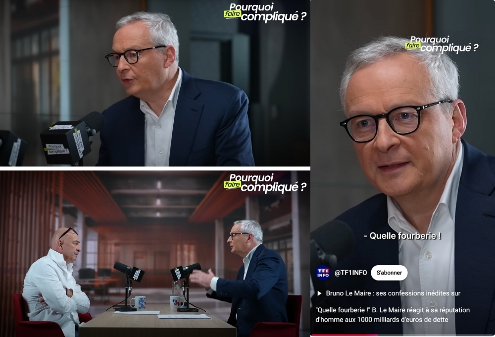 En invitant des figures comme Bruno Le Maire à parler “hors plateau”, TF1 explore une nouvelle grammaire médiatique : celle du dialogue posé où la pédagogie remplace la confrontation et la culture de l’horloge où il faut répondre vite et bien pour ne pas ennuyer les télespectateurs. Ils s’inspirent fortement des podcasts comme Legend, Thinkerview et Brut où les politiques se bousculent et leur permet de ne pas laisser filer l’audience chez de nouveaux acteurs.